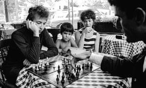 This was shot up in Woodstock. Dylan used to go up there when he wanted to get out of the city to write music. It was taken the first day I met him, during that five-hour session. He didn’t want to sit for just a normal portrait. He said to me: “Do what you want.” So I shot him around Albert Grossman’s house. Then it was time to go to lunch. This was at an outdoor part of a local cafe where Dylan went regularly. The chess shot wasn’t set up. It was just part of how Dylan was spending his day. He was playing chess with his road manager, Victor Maymudes. The woman and her son were just locals who knew Dylan from coming to the cafe. Interestingly, that cafe was later converted into the Center for Photography in Woodstock. Forty years after I made this picture, I had a show in that same facility featuring these photos.