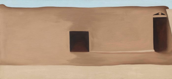 O'Keeffe discovered Ghost Ranch – the property that was to become her home – in 1934, finally purchasing the house in 1940. The view from the ranch, a flat-topped mesa, became her favoured view. She painted and repainted it, saying at one point: “God told me if I painted it enough I could have it.” She also discovered the “Black Place”, another location she revisited throughout her life whilst driving through the Navajo country. These black hills, often abstracted into almost signs, recurred throughout her work became one of the locations of seriality-working through different permutations while also moving towards abstraction, the strong natural forms reduced into powerful symbols. A series of views of paintings of her front door marry the increasing abstraction of an artist such as Piet Mondrian with the observation of Claude Monet, quite a feat for a woman in the early 20th century.