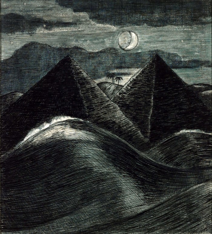 This irreducibly strange vision shows roiling seas by night, two pyramids dropped among them, and sand dunes metamorphosing into waves. It is a vision from the land of counterpane, made when Nash was scarcely 23. Yet it contains the future like a kernel – the intermingling of land and sea, the premonition of surrealism,the Samuel Palmer moon (long before Palmer was discovered in the 1920s) of Nash’s English nocturnes. Above all the bell-shaped waves that rise and fall across the picture, and all through the rest of his work.