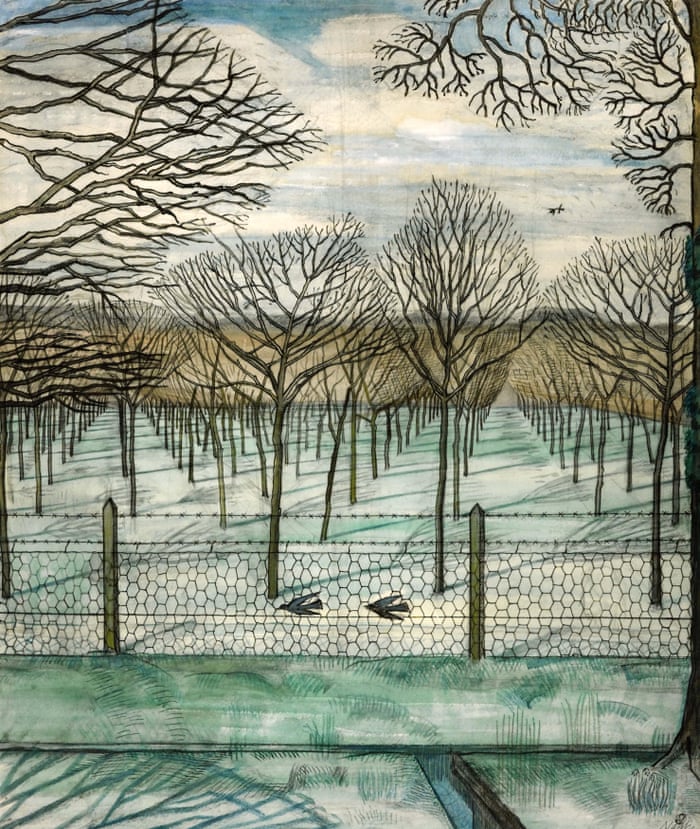 The Cherry Orchard, beautifully positioned at the entrance to this enormous show– the first full-stretch survey in a generation – sets the tone from the start. An array of trunks casts diagonal shadows on the landscape, which is divided again by wire fencing as the sky is crisscrossed by stark branches. These are the bare ruin’d choirs of Shakespeare, and yet the watercolour was made in leafy July. Nash was temporarily home from the trenches in 1917. His image is distanced from life, while partaking of it: he sees the ribs, bones and ghosts in the landscape.