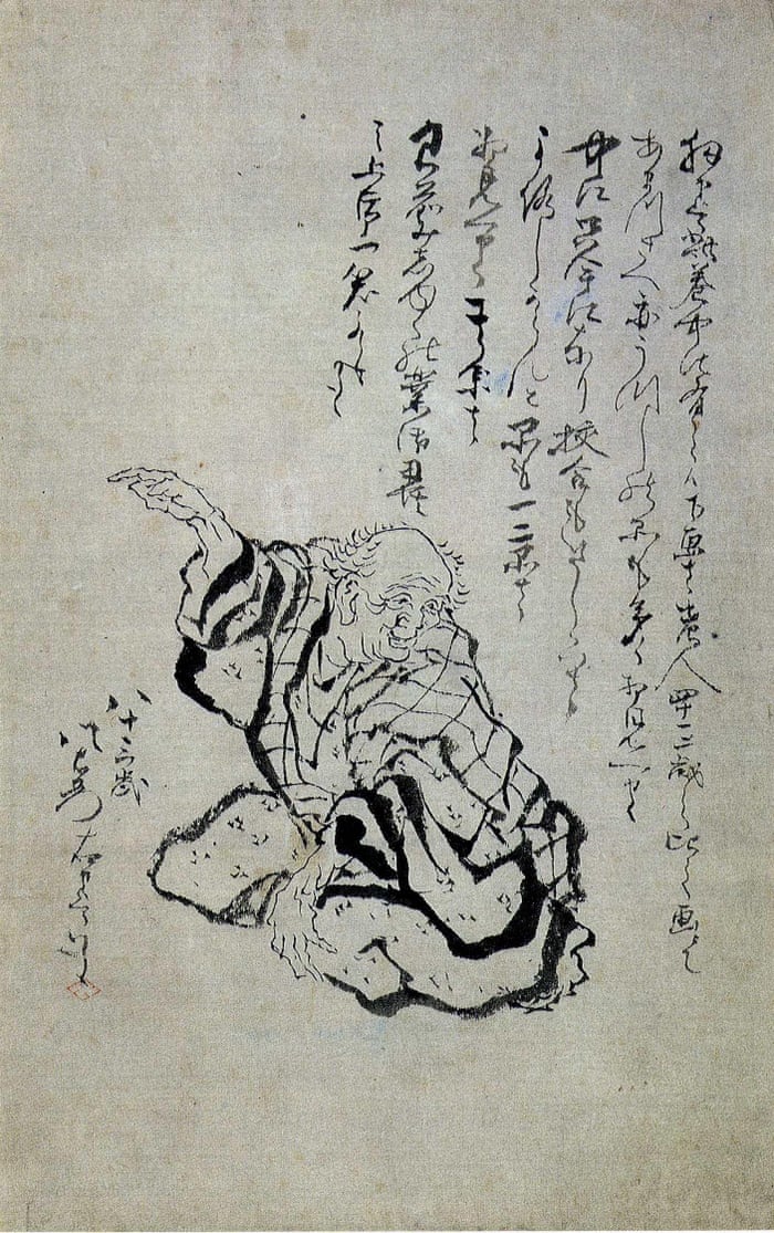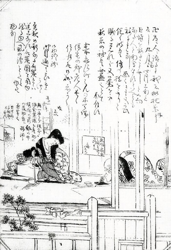 An image of their situation is preserved in a memory-sketch by Tsuyuki Kōshō, one of Hokusai’s pupils, showing the master in rented lodgings, covered by a quilt, hunched over an ink painting on the tatami mat. Ōi watches him intently, smoking a long tobacco pipe. An inscription on the drawing says that rubbish was piled in the corner of the studio, food wrappings and other detritus. On the wall hung a sign: “We strictly refuse to paint albums or fans” – although you can imagine them taking on the work anyway.