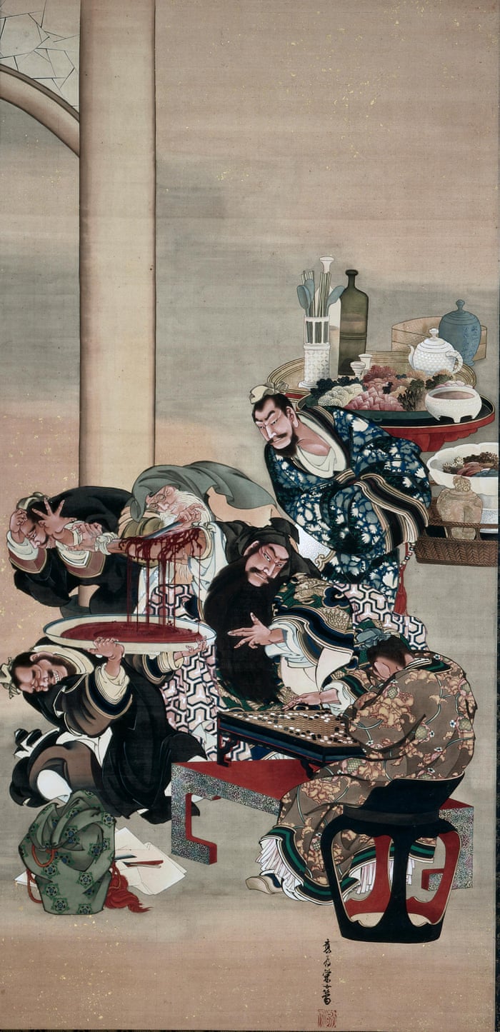 Set alongside his prints, Hokusai’s rarely exhibited late paintings – large hanging scrolls on silk and paper – strike a different note. The subjects are often fantastical: a great dragon writhes in a rain cloud rising above Mount Fuji; a seven-headed dragon deity flies in the sky above the monk Nichiren (Hokusai was a devout follower), sitting on a mountain top reading from a sutra scroll.