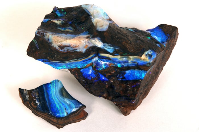 Opal stones … ‘These gorgeous rocks set this exhibition alight with their strong colours and brilliant crystal facets’ Photograph: Hazel Drummond/Collection of the Guild of St George/Museums Sheffield