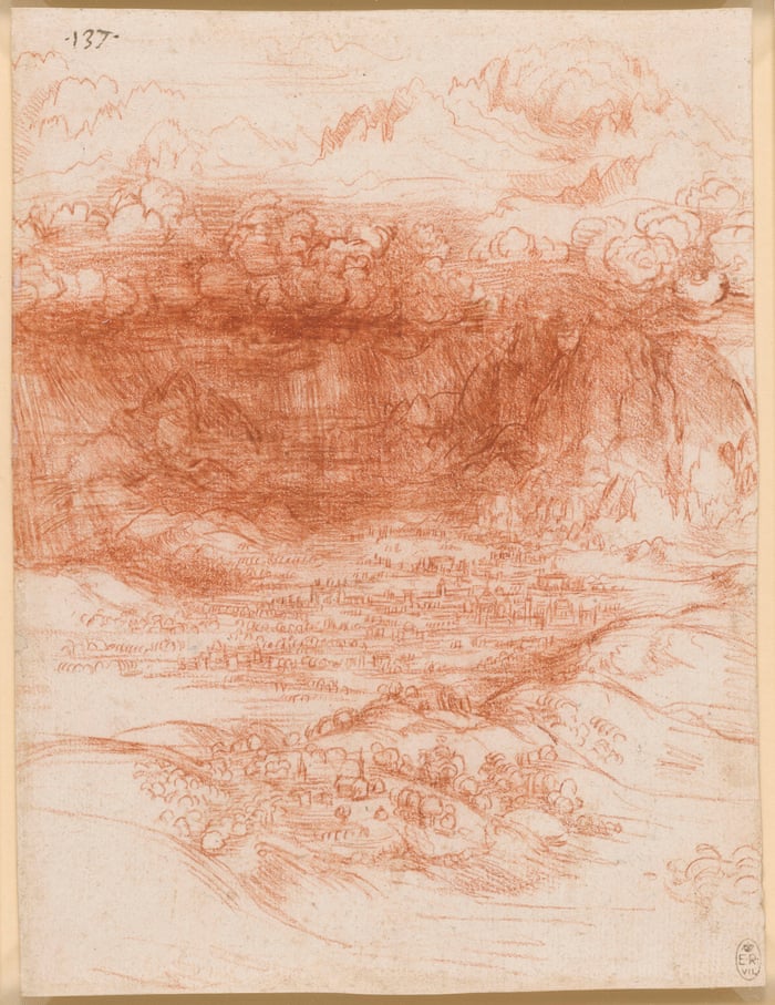 In his drawing of A Storm Over a Valley he uses red chalk again, this time to create what feels more like a modelling of the atmosphere than a mere landscape sketch. Rolling banks of cloud billow above a mountain valley, releasing heavy cascades of rain on the settlements below. But what’s spooky is the point of view. Leonardo seems to be looking down on the little human world of churches and farms from far, far above.