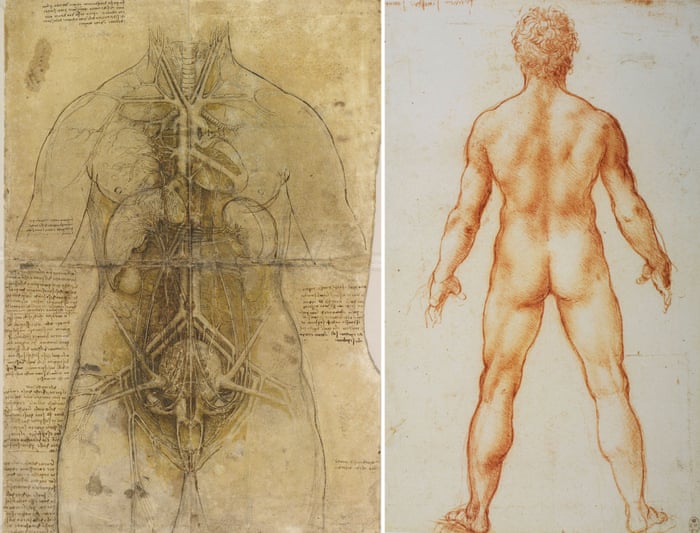 The cardiovascular system and principal organs of a woman; and Study of a male nude from behind, by Leonardo da Vinci. Composite: Royal Collection Trust/Her Majesty Queen Elizabeth II