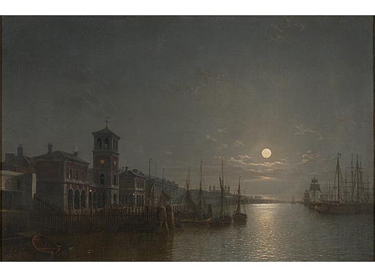 For Abraham and his sons, Henry and Sebastian Pether, moonlit and dramatically illuminated scenes became signature works. During the early 19th century this family of artists established a reputation for producing a series of nocturnal, atmospheric paintings, which were both part of an artistic and a scientific enterprise. In addition to his career as an artist, Abraham Pether had an extensive knowledge of scientific subjects and gave lectures on electricity. ‘His philosophical and mathematical researches deserve every praise: he was an admirable mechanic, and had constructed telescopes, microscopes, and almost every instrument relative to science, upon the grandest and most improved principle’, an obituary reported. Both Abraham’s sons, Henry and Sebastian followed their father’s example and continued the tradition of moonscapes.