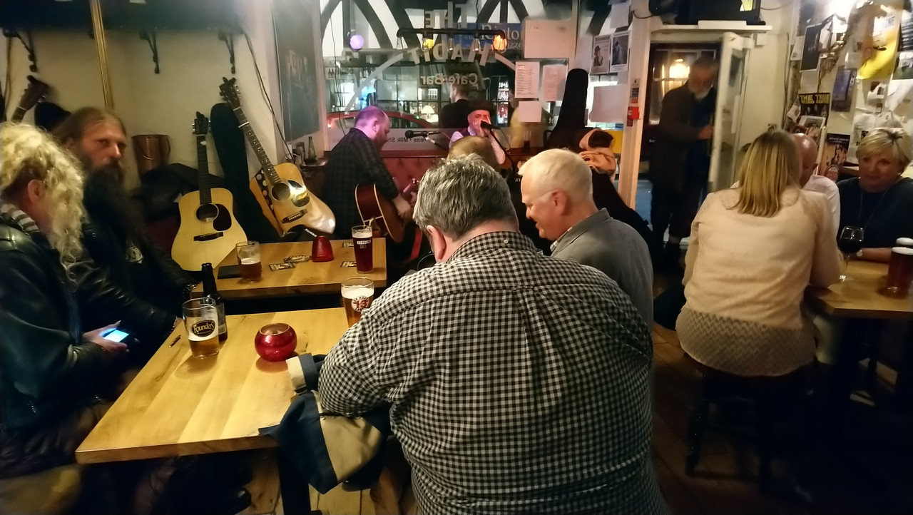 The bar was full for most of the evening for The Habit open mic, with plenty of players and punters. Regular, and harmonica virtuoso, Tim joined host Simon for some bluesy numbers (pictured above) including a vigorous rendition of Leiber/Stoller's Kansas City. Tim later joined The Elderlys on their first two numbers. Ron sported his new harmonica brace on Sweet Virginia. Having seen earlier in the evening that it was 50 years to the day since the release of Crosby Stills and Nash (known to fans as The Couch Album), I paid tribute with David Crosby's Long Time Gone, with folks adding harmonies too. For the after-show acoustic jam, Ron and I were joined by regular Debbie and a posse of punters to sing the night away until closing time. Another grand night of Habit mayhem!