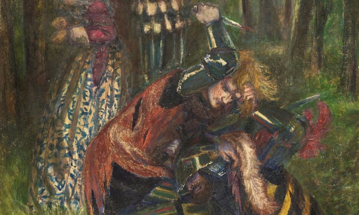 The startling watercolour shows two knights of Arthurian legend, Dinadan and Breuze, in a knife fight. Behind them is a dead man hanging from a tree and a terrified woman being held against her will with a halter around her neck.