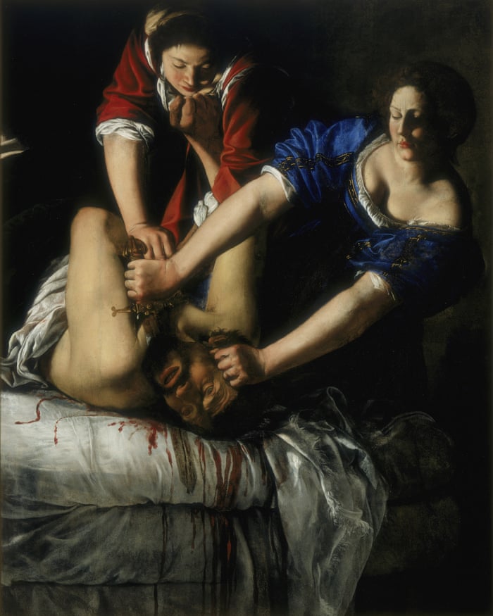 For us it looks like a direct allusion to her ordeal of rape, torture and humiliation. It would have had that meaning for its first audience, too. The 1612 trial made Gentileschi notorious. She painted this testimony in Florence, where she rebuilt her life and career under the patronage of the Grand Duke of Tuscany. Her gory painting Judith Slaying Holofernes, which can still be seen in Florence’s Uffizi Gallery, seems to fantasise revenge in its gruesome vision of a bearded man who has just woken to find one muscular woman pinioning him on his blood-spattered bed while another is halfway through hacking his head off.